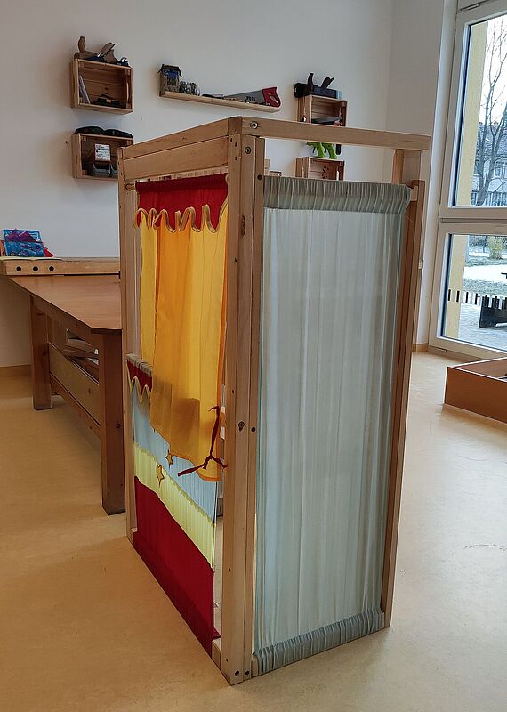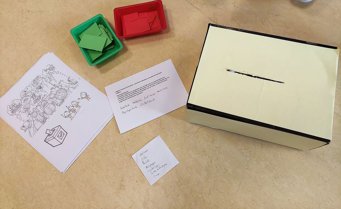 Dann wurde eine geheime, demokratische Wahl durchgeführt: Das Puppentheater wurde als Wahlkabine genutzt, eine Kiste mit einem Schlitz diente als Wahlurne. Die Kinder konnten entweder mit einer grünen Karte für „Ja” oder einer roten Karte für „Nein” abstimmen. Für jeden Namensvorschlag gab es einen Wahlgang und eine gemeinsame Stimmenauszählung. Auch jüngere Kinder, die zu Gast in der Vorschule waren, durften mitwählen. Allen war es wichtig, dass niemand ausgeschlossen wird.