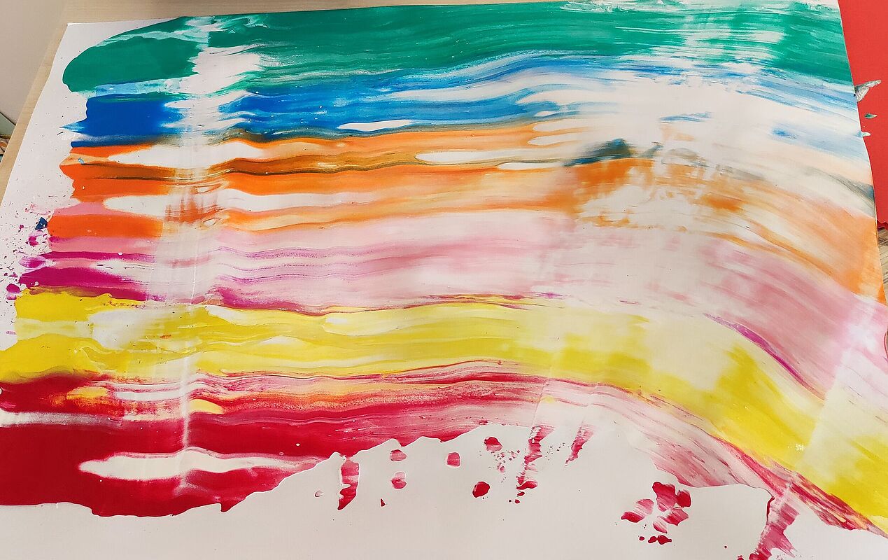 Die Kinder wählten mehrheitlich den Namen „Regenbogenbande“ und setzten direkt ihre Idee um, Regenbögen mit Fingermalfarben zu malen. So wurde das Wahlergebnis für alle sichtbar gemacht.